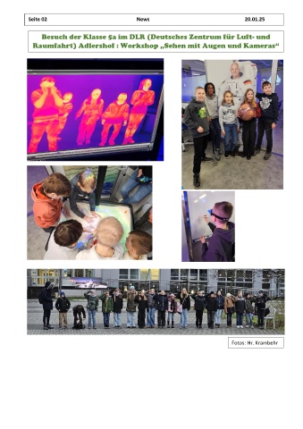 Seite 02 News 20.01.25 20.03.2019 Besuch der Klasse 5a im DLR (Deutsches Zentrum für Luft- und Raumfahrt) Adlershof : Workshop „Sehen mit Augen und Kameras“ Fotos: Hr. Krambehr