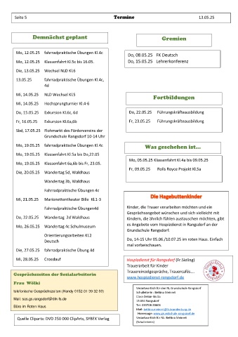 Mo, 12.05.25 Klassenfahrt Kl.5c bis 16.05. Do, 15.05.25 Lehrerkonferenz